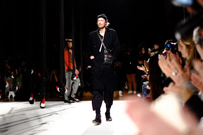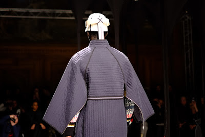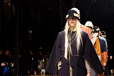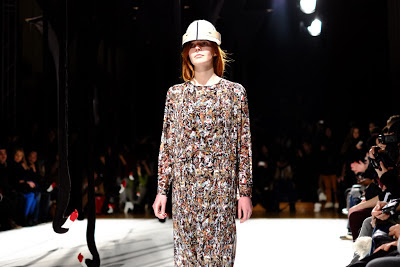 "Henrik Vibskovs‘s showman’s flair and penchant for avant-garde oddity was again on display for Fall/Winter 2013. “The Stiff Neck Chamber” was the name given to his Paris presentation – a merging of visual, audio and tactile elements that will have a thematic sibling in “Neck Plus Ultra,” his upcoming solo art exhibition. Hewing closely to its title, the collection was kicked off with a multitude of upside-down black flamingo necks that lined center stage, creating the conceptual “stiff neck chamber” promised to attendees. The first two looks, however, referenced a very different sort of chamber — a duo of models in gas masks set the mood for Vibskov’s procession of both men’s and women’s garments, each outfit topped off by headwear supported from the backs of models’ necks. South of the collar, the garments were vintage Vibskov — marled leggings, color-blocked, paneled knits and relaxed silhouettes featured throughout, while dotted patterns and flamingo prints were all-new for the season."